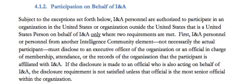 As both the Executive Order and the Office of the Director of National Intelligence’s guidelines make clear, the issue of disclosure is hardly one of transparency. The only disclosure of participation that needs to be made is to “appropriate officials of the organization.”