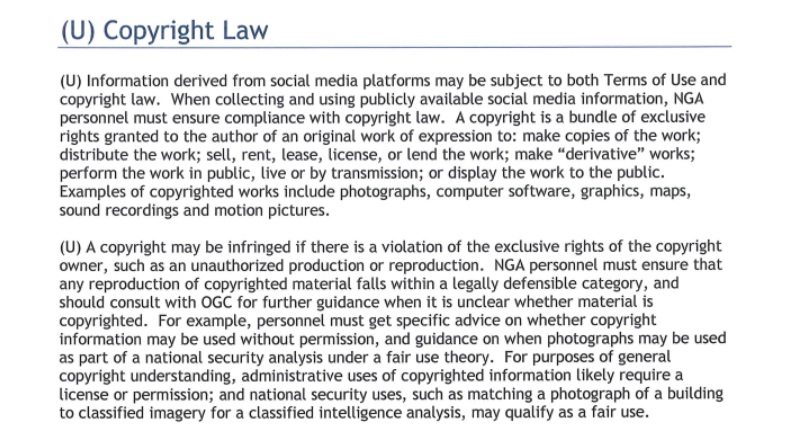 Perhaps surprisingly, copyright can be a stumbling block to government reuse. The guidance notes that “administrative uses of copyrighted information likely require a license or permission.” While “national security uses, such as matching a photograph of a building to classified imagery for a classified intelligence analysis, may qualify as fair use” NGA personnel are still instructed to “get specific advice on whether copyright information may be used without permission, and guidance on when photographs may be used as part of a national security analysis under a fair use theory.”