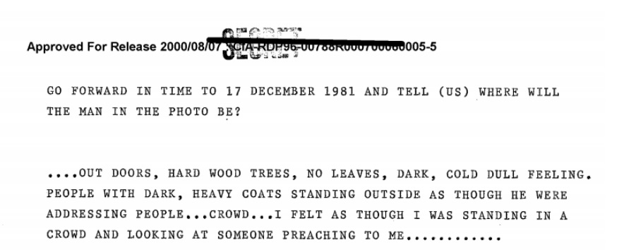 It’s unclear what prompted the USSS’ request for help, but it resulted in those psychics trying to look forward in time to find the person. In the course of several sessions, they made several predictions – one involving a nuclear bomb, and another with a political shooting. When the forecasted events didn’t happen, INSCOM pointed out that it could have been the butterfly effect, not bad intelligence.