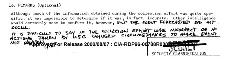 The other report, signed by Army Major John Bryant, Jr., notes that “although much of the information … was quite specific, it was impossible to determine if it was, in fact, accurate.” However, “other intelligence would certainly seem to confirm it.” What this “other intelligence” was isn’t discussed in the Project 8124 documents, though it could easily be the photographs which were synced up with the reports. The report has a handwritten note conceding that “the event forecasted did not occur.” This didn’t mean that the information was inaccurate, however – unspecified actions taken by the U.S. Government might have indirectly prevented it.