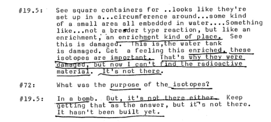 A number of sessions were conducted, with some more interesting than others. In one, a psychic reported a facility that was working to produce a nuclear bomb.