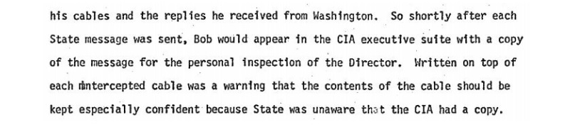 In another passage, Marchetti accused “Bob X” of secretly intercepting copies of communications of the other parts of the U.S. Government and providing them to the CIA Director, who was reminded that they “should be kept especially [confidential].”