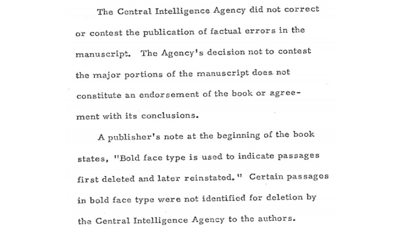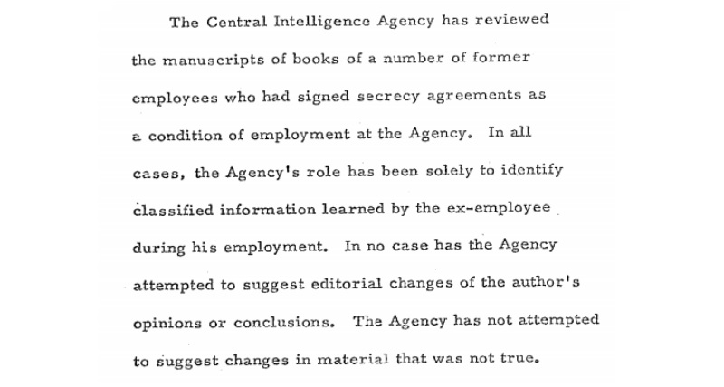 In their statement that they didn’t contest factual errors in the manuscript, the Agency asserted that “in all cases, the Agency’s role has been solely to identify classified information learned by the ex-employees during his employment. In no case has the Agency attempted to suggest editorial changes of the author’s opinions or conclusions. The Agency has not attempted to suggest changes in material that was not true.”