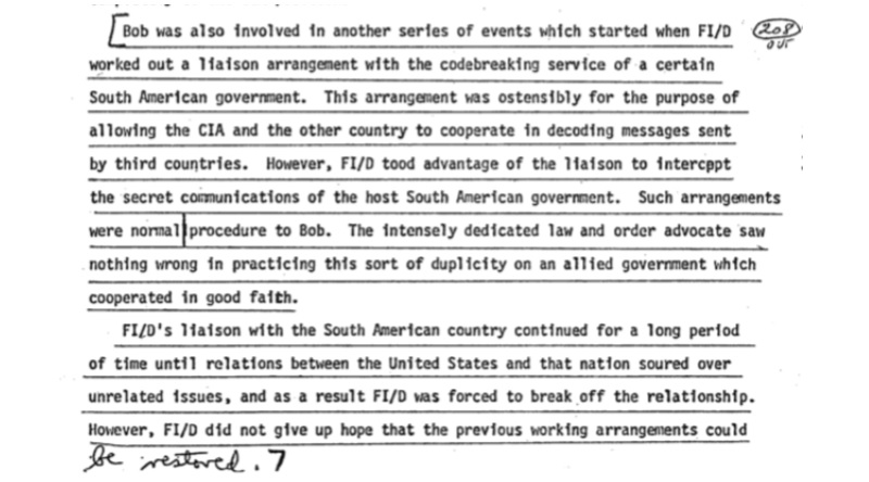 One excised passage highlighted the Agency’s duplicity in their liaison with the code breaking service of an unspecified South American country. According to Marchetti’s manuscript, they “took advantage of the liaison to intercept the secret communications of the host South American government.” The officer in charge of this “saw nothing wrong in practicing this sort of duplicity on an allied government which cooperated in good faith.” It’s easy to see why the Agency would have wanted that excised from the book. Regardless of its veracity, the mere accusation could be damaging.