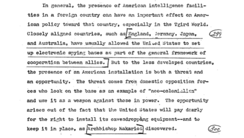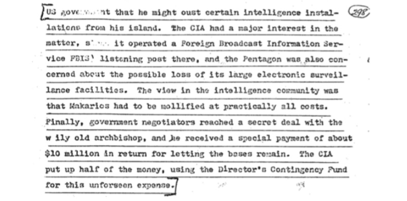 In another passage, which is referred to but censored in the published book, Marchetti alleges that the Agency gave the President of Cyprus, Archbishop Markios, several million dollars in bribes to allow them to continue operating an intelligence installation open on the island. According to Marchetti, the Agency had an interest in the facility because it housed a Foreign Broadcast Information Service listening post, while the Pentagon was also worried about “the possible loss of its large electronic surveillance facilities.” To prevent this from happening, CIA allegedly gave the Archbishop a $10 million bribe. Adjusting for inflation, the value of the bribe would be well over $70 million in 2018 currency. Marchetti’s text gives no indication that the money was paid to the government of Cyprus rather than directly to the Archbishop.