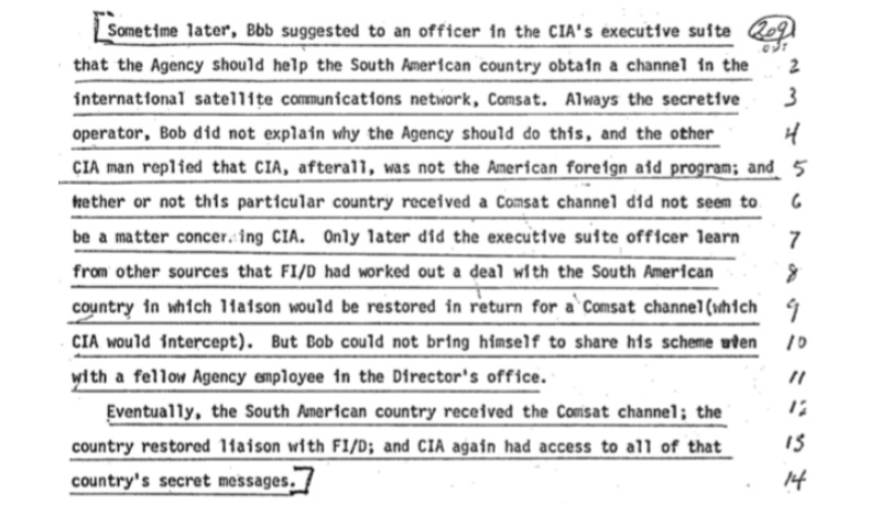 Although the liaison, and thus the opportunity, fell apart for a time, it was eventually restored as a result of a suggestion from “Bob X” in a closely held scheme. By helping the South American government get a channel on the international satellite communications network, Comsat, the Agency was able to create a situation where they once more were able to listen in on the country’s secret communications.