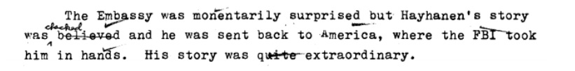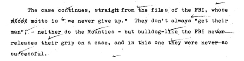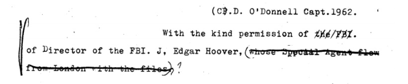 As for whether the corrections not only went through his office, but were personally made by Hoover, the FBI reviewer would neither confirm nor deny. They did, however, strikethrough the section stating that one of Hoover’s Special Agents had flown from London with the files. The entire section was ambiguously highlighted, with a question mark written at the end.