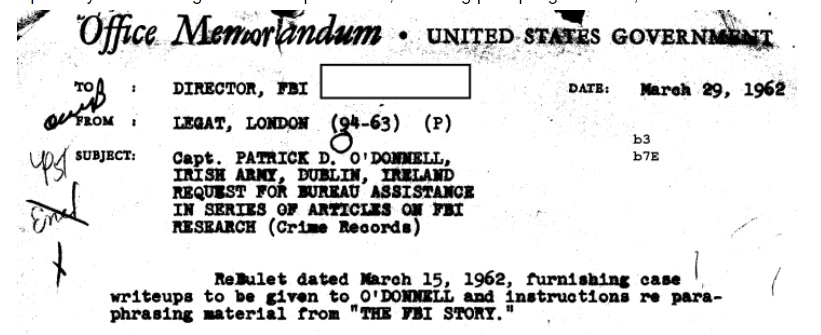 According to the file, Patrick D. (possibly short for Denis) O’Donnell, had written the FBI requesting assistance with an article. O’Donnell was provided with FBI write ups to use as a source, and it was requested that the Bureau be allowed to review his articles to keep them “within the bounds of authenticity and accuracy.” The request was sent to Hoover by the Legat office in London. While the draft article indicates that Hoover did indeed review the article, the Bureau’s “fact check” of that particular statement is ambiguous.