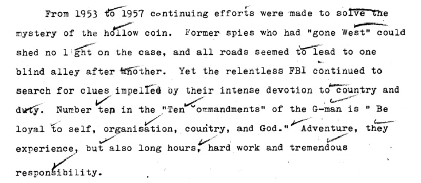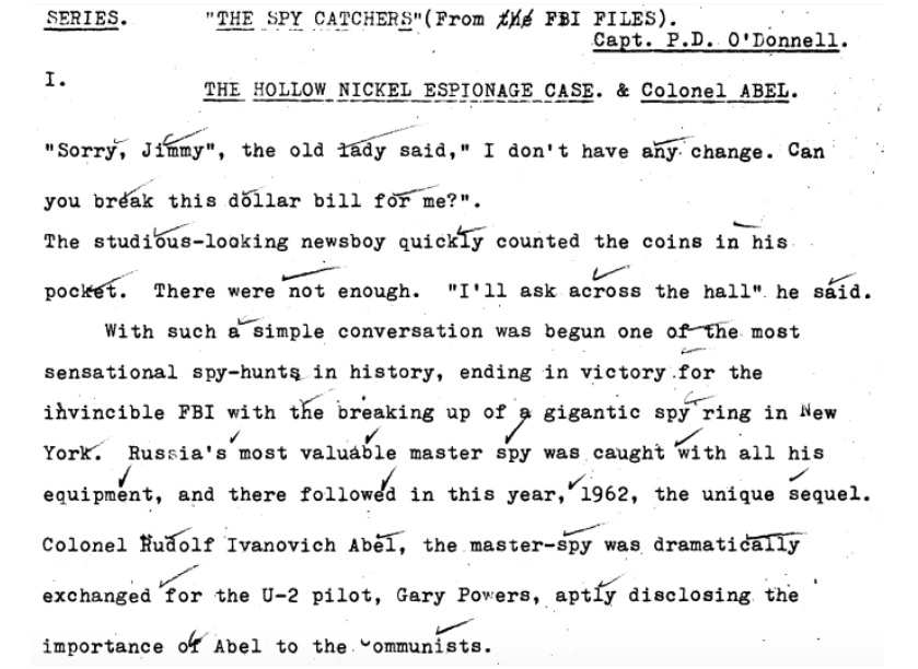 Apparently this was to be the first in what would be a series of articles about Colonel Abel, of Bridge of Spies fame, and the now-lesser known Hollow Nickel case. The FBI reviewer checked off statements that were true and made notes of corrections in several other places.