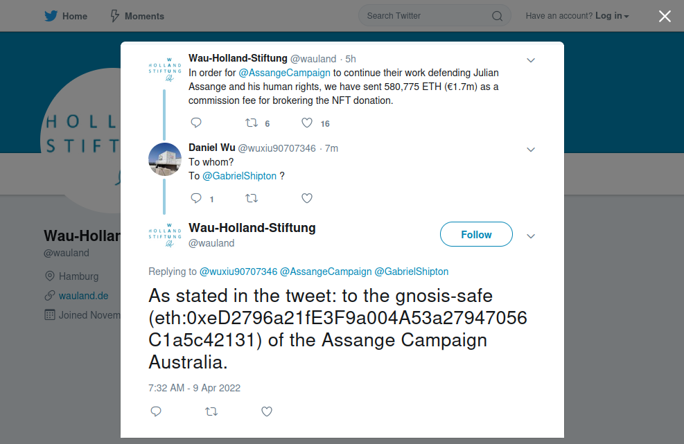 In their initial explanation, Wau Holland Stiftung tweeted an announcement that the payment was “a commission fee for brokering the NFT donation” that was being paid to Assange Campaign Australia “in order for [them] to continue their work defending Julian Assange and his human rights.”