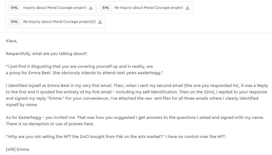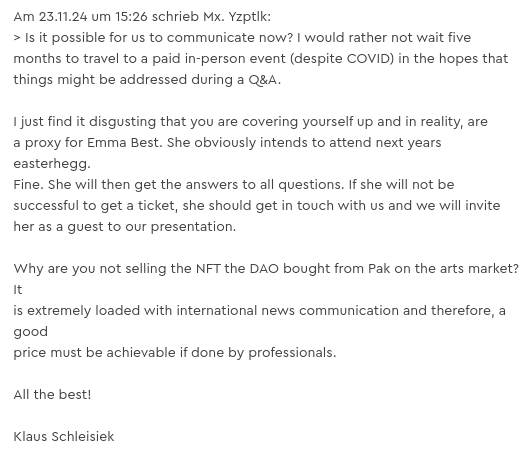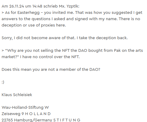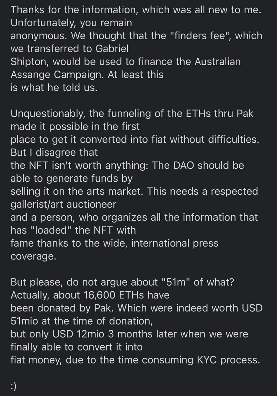 In February 2025, screenshots of emails from Wau Holland Stiftung surfaced which seem to provide a third narrative, an odd synthesis of some of the statements previously provided by Wau Holland Stiftung and Gabriel Shipton. However, the email’s author noted that they were describing events from memory. According to the screenshots, which were posted by AssangeDAO member su dongpo, the payment was a “finder’s fee” that was paid to Gabriel Shipton rather than the Assange Campaign. The reasoning behind this was that while the Assange Campaign was a not for profit association, it was not a charitable organization.