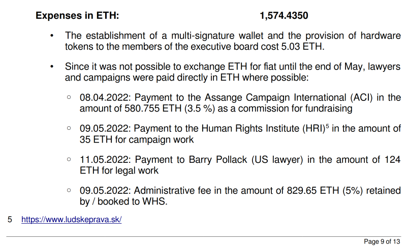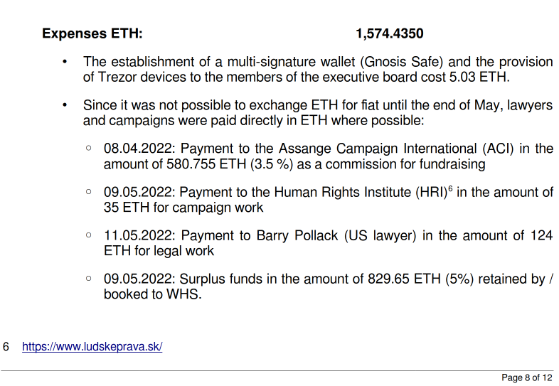 While Wau Holland Stiftung’s understanding was that Gabriel would use the funds for Assange Campaign Inc, it is unclear if or how that has been reviewed or enforced. As of this writing, slightly over 113.5 ETH of the original 580 ETH remain in the gnosis wallet. Public records indicate that Assange Campaign Inc. has not filed any annual statements which might shed light on the matter or held any annual meetings since February 10, 2022, two days before Pak transferred the AssangeDAO funds to Wau Holland Stiftung.