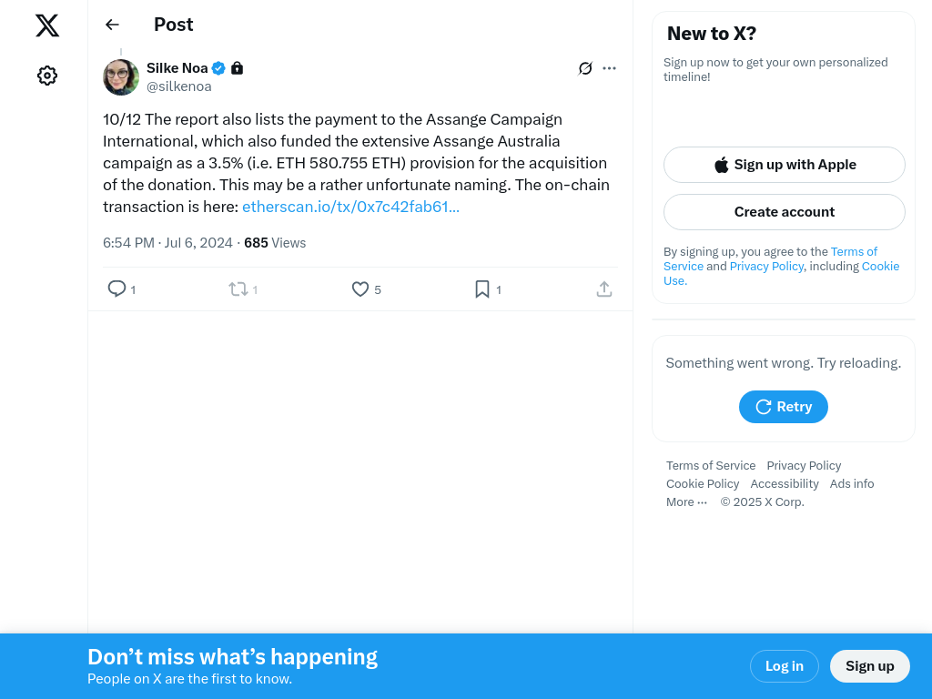 In June and November 2024, Wau Holland Stiftung released a pair of transparency reports which labeled the payment as having been made to Assange Campaign International. It is unclear what Assange Campaign International is, and if it is a legal entity or not. Members of Wau Holland Stiftung have been what it is on multiple occassions and declined to answer. According to a twitter thread by Silke Noa which was reported by Binance, Assange Campaign International “funded the extensive Assange Australia campaign” and may suffer from “a rather unfortunate naming.”