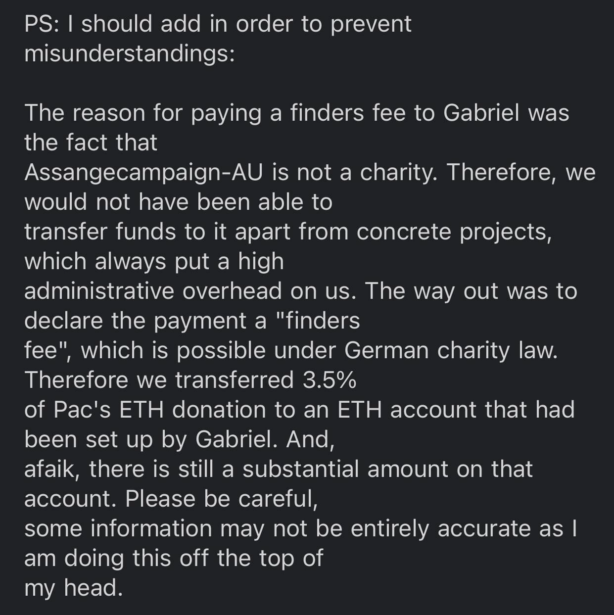 Therefore, we would not have been able to transfer funds to it apart from concrete projects, which always put a high administrative overhead on us. The way out was to declare the payment a “finders fee”, which is possible under German charity law. Therefore we transferred 3.5% of Pac’s [sic] ETH donation to an ETH account that had been set up by Gabriel.