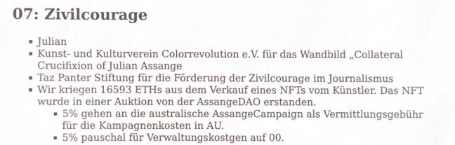 Mysteriously, in 2023 Wau Holland Stiftung left an internal document at EasterHegg 20 which states that the transfer was a commission and that the funds would go towards campaign costs in Australia. What is noticeably different, however, is that the internal document places the commission fee at 5%, rather than the publicly declared 3.5%. Wau Holland Stiftung has declined to explain the discrepancy.