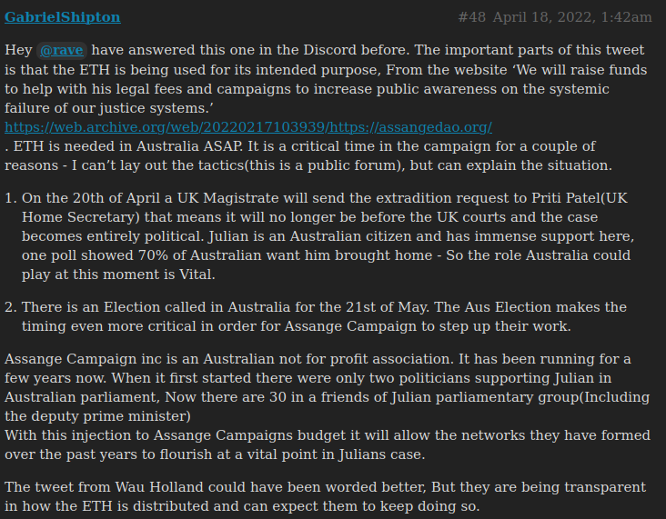 Gabriel Shipton replied that the important thing was “that the ETH is being used for its intended purpose.” He explained that the ETH was “needed in Australia ASAP” because it was a critical time for the campaign, pointing to a then imminent ruling in Julian’s extradition case and the 2022 Australian election, while emphasizing that Assange Campaign Inc. is a not for profit organization. He ended his post by saying that Wau Holland Stiftung’s tweet could have been phrased better, but that they were being transparent in how the ETH was being distributed.