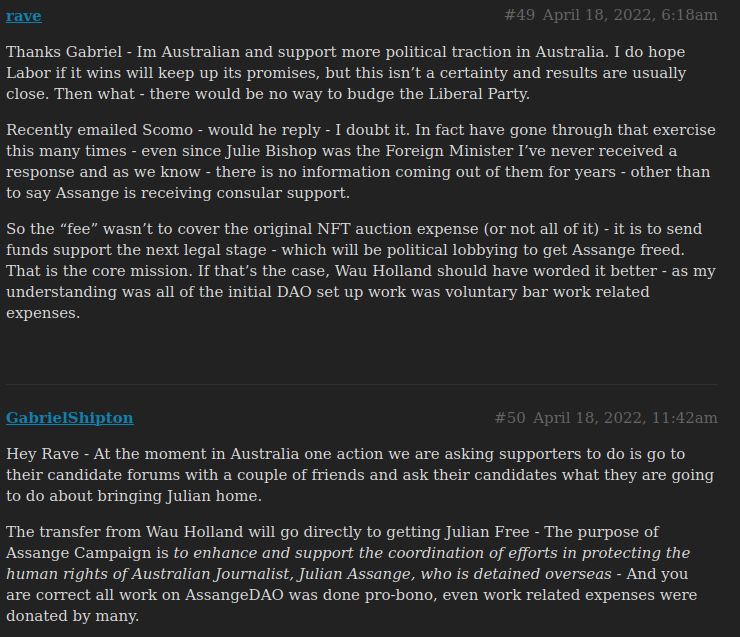 Members of the AssangeDAO forum interpreted this as meaning that the payment was simply to support Assange Campaign Australia’s activities, and wasn’t meant to cover NFT auction expenses. Gabriel partially confirmed this, saying that the work had been done pro bono and that the ETH would support Assange Campaign Australia’s work.