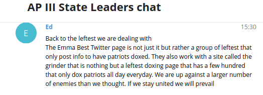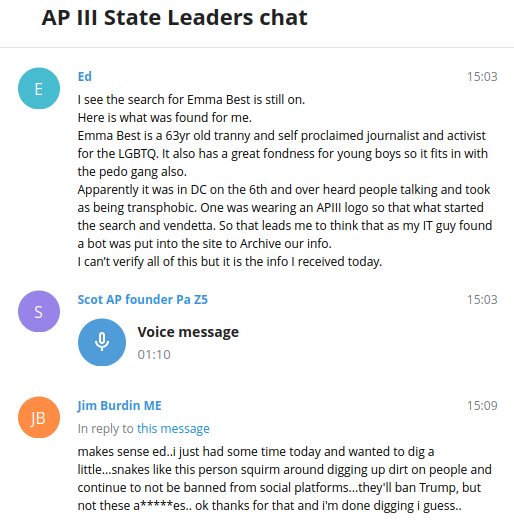 On the 13th, John, of AP III’s national commanders, posted a 2 minute message to the State Leader chat instructing members to stalk my social media accounts and look for references to locations I had been, trips I had taken, and anything that he could use to help narrow down my location. He bragged about having run background checks on everyone in DDoSecrets, but said he’d been unable to run one on me – or rather on “Emily Best.” John said he didn’t think “Emily Best” was my real name and brought up something he called a “biological name.” (Apparently transphobes think pronouns aren’t real, but that names are assigned to us biologically.)