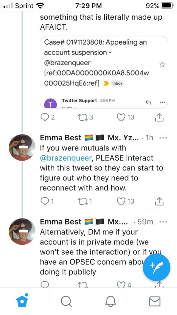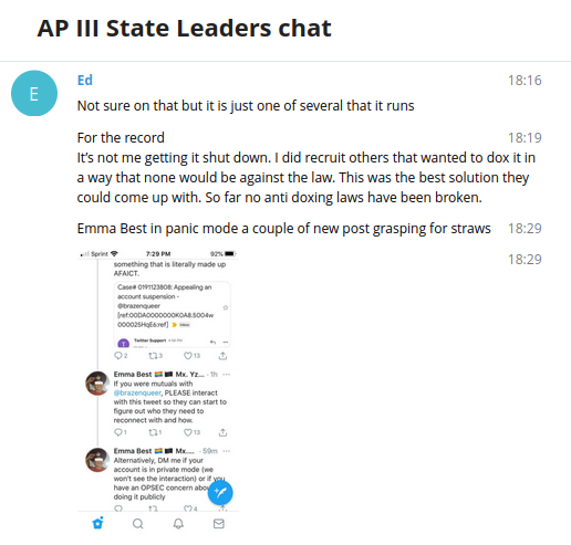 On the 17th, Ed returned to the State Leaders’ chat to say that he had recruited others that wanted to take part in a doxing campaign, and that they had settled on mass reporting accounts that they thought were associated with me. Ed said that “so far no anti doxing laws have been broken,” and claimed responsibility for my wife’s Twitter account being suspended. As far as we could tell at the time, the alleged violation was fabricated and Twitter cited their posts about the contents of BlueLeaks.