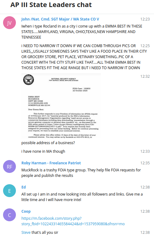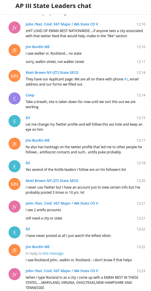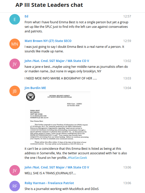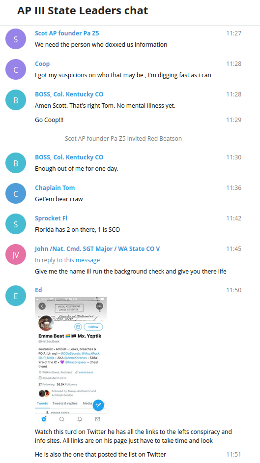 They quickly began moving onto conspiracy theories. One member of the AP III State Leaders chat said that from what he had found, “Emma Best is not a single person but yet [sic] a group set up like the SPLC just to find info the left can use against conservatives and patriots.” Other members of the chat said they doubted that Emma Best was a real name for a person, saying it “sounds like a made up name,” having forgotten the numerous people with that they found in different states. (Plus, all names are made up and it is my real name.) Despite one person pointing out that they should be more concerned with where or who I got the files from and people in the chat were clearly looking at my Twitter thread, they seemingly never noticed that I acknowledged my source in it, with their permission.