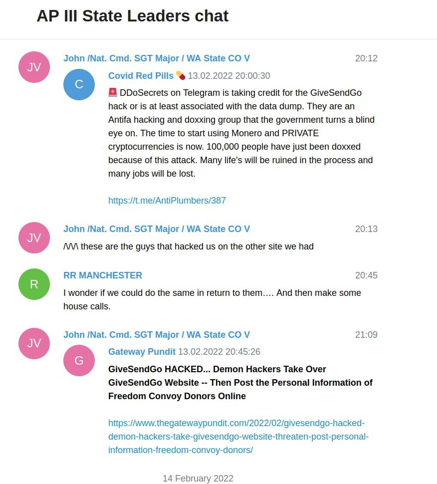 For the next year, there seem to be no mention of me or DDoSecrets in the leaked AP III chats. In mid-February 2022, we returned to their attention when John forwarded a post from an account called “Covid Red Pills.” In a typo and conspiracy theory ridden-post, “Covid Red Pills” falsely said that DDoSecrets was “taking credit for the GiveSendGo hack” on Telegram before hedging by adding “or is at least associated with the data dump.” (This misunderstands the order of events and how the information was released.)