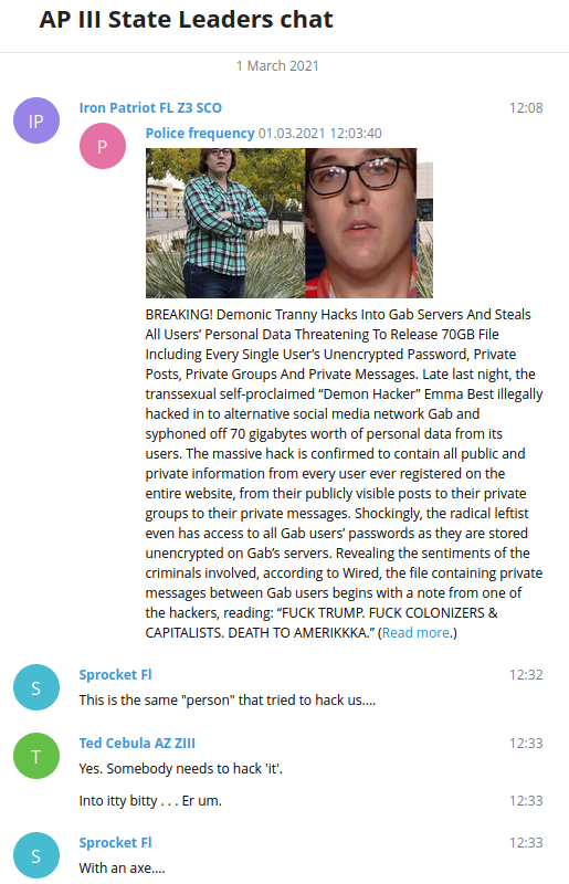 At the end of February, news of GabLeaks broke and the far-right immediately went into overdrive. Andrew Torba, Gab’s CEO, seemed to blame DDoSecrets not just for publishing the leak but for the hack. In a post he blamed “mentally ill tranny demon hackers” before immediately clarifying that he was “very serious” and describing a DHS bulletin that’s had its claims discredited. In other posts, he went as far as repeating the charge and posting pictures of members of DDoSecrets. Someone forwarded a post to the State Leaders chat with my picture and a number of erroneous claims, from incorrectly blaming me for the hack, to conflating the news of the hack with the date of the hack, to saying the “demon hacker” label had been “self-proclaimed” instead of reappropriated after Torba’s slur, to misunderstanding what was in the data.