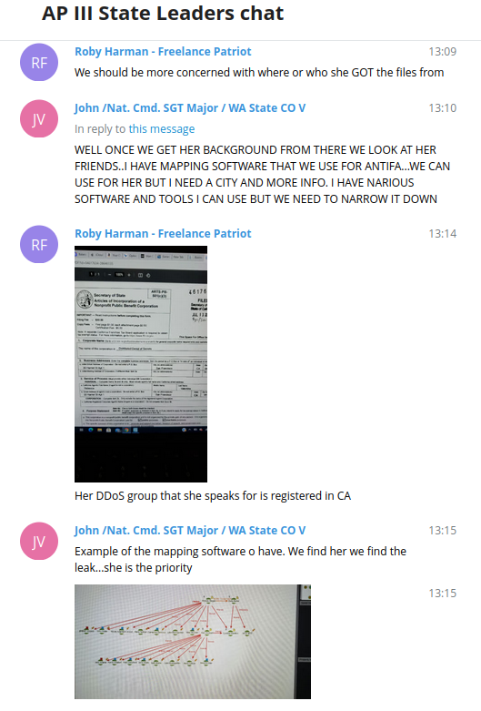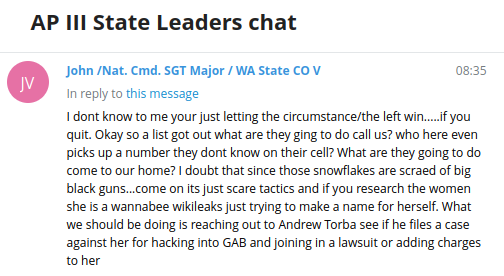 Several days later, AP III’s State Leaders hadn’t forgotten. One suggested that they should work together with Andrew Torba, suggesting that if Torba filed a case against me, they could either join a lawsuit or seek to add charges. One of my (recently arrested) stalkers seems to have provided Torba with information, in addition to harassing, doxing and spreading false information about members of DDoSecrets.