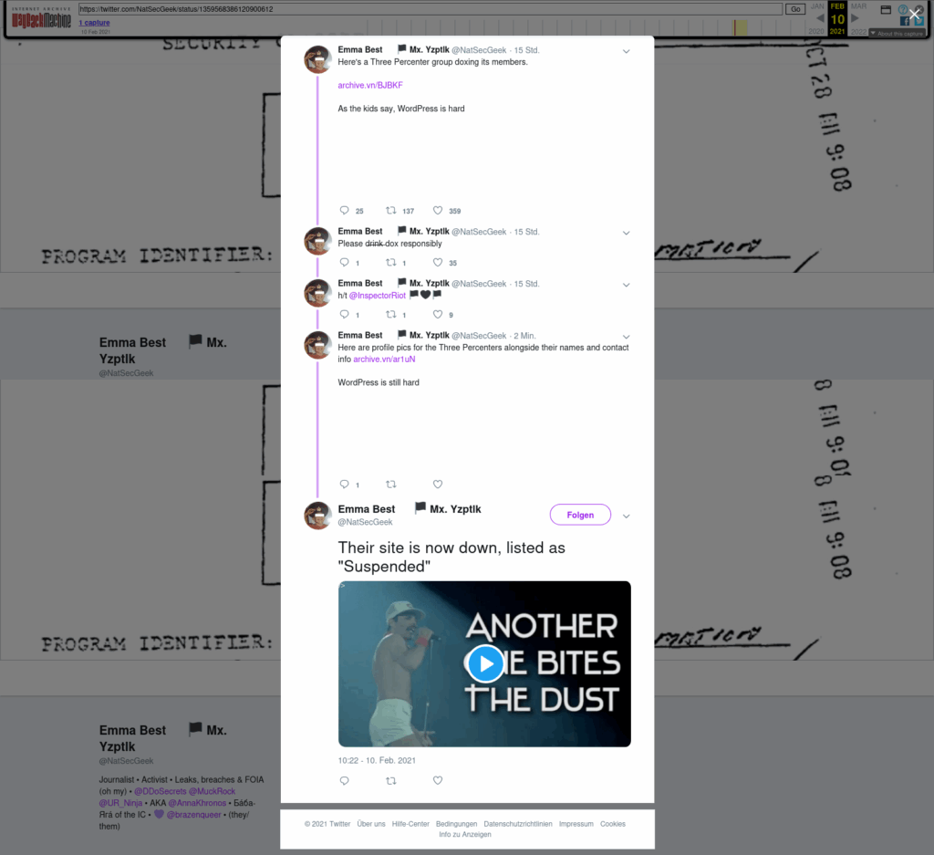 In early February 2021, I received a tip about a militia website that was, for whatever reason, displaying the organization’s internal member information, including their names and other personally identifiable information (PII). I looked into the website’s leak of American Patriots Three Percent (AP III) member information, and decided to share it with the public. In doing so, a chain reaction began in which DDoSecrets, my family and I were all targeted by the militia and other right-wing figures in a campaign of harassment and doxing.