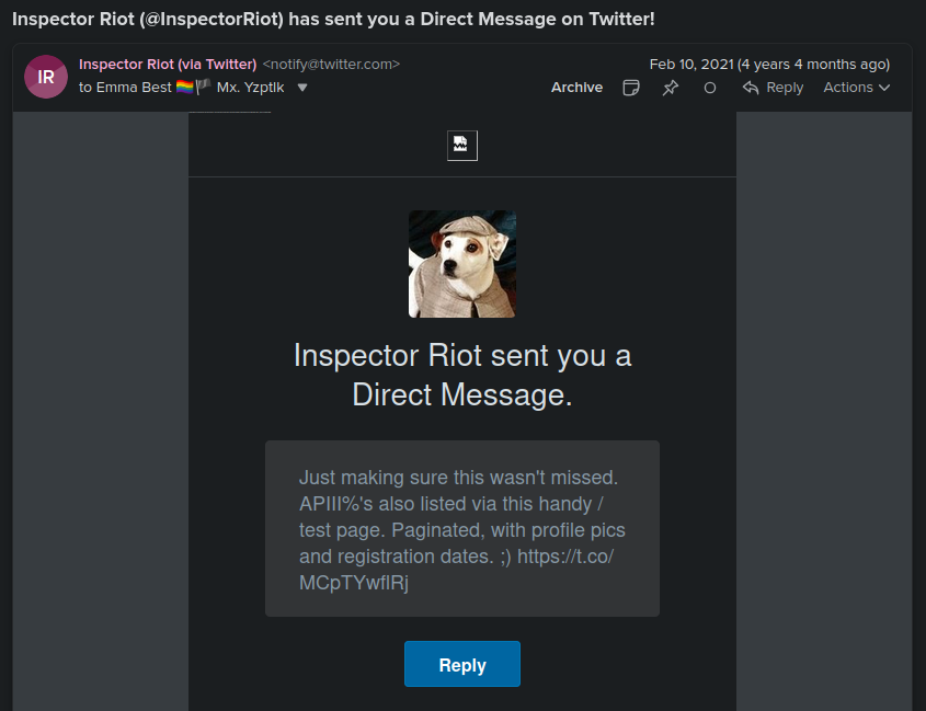 Thankfully, AP III has never made any house calls and my stalkers and doxers have never gotten further than posting pictures and the address of my old apartment – though they incorrectly believed I still lived there at the time. The harassment targeted me and my family, members of DDoSecrets and seemingly random people that were thought to work with or near me. It continued for years, and Torba and others continue to spread misinformation related to DDoSecrets.