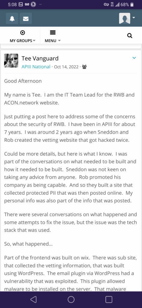 AP III’s interpretation of the leak varied, but the effect was immediate: paranoia and fury. The site was shut down, and theories spread blaming the leak on an insider, on website vulnerabilities and on hackers. Messages later posted to AP III’s state and national leadership chats indicate that they believed the website was hacked on two separate occasions, at least one of which they blamed on WordPress plugin vulnerabilities and malware.
