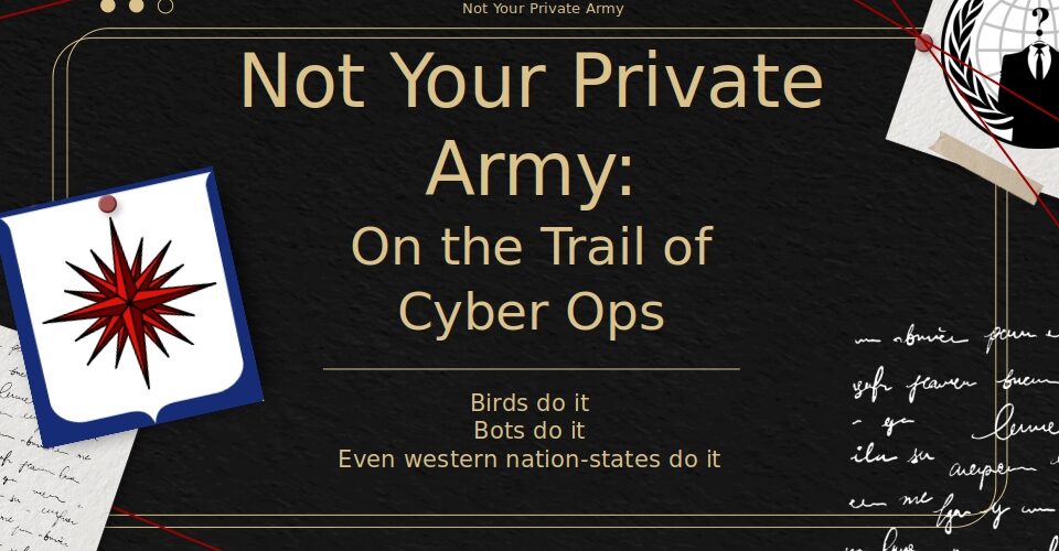 Alex Urbelis: This is like, this is the day for, I think, journalist-related talks, isn’t it? It’s a pretty awesome presentation from Joe Cox that just happened. And I think now we have another very special talk from a friend and colleague, Emma Best, Not Your Private Army on the Trail of Cyber Ops, which is going to be another, I think, really fascinating, interesting tale that interweaves criminal operations, hacker culture, and the U.S. federal government and, I think, aspects of the intelligence community as well. So, many of you know Emma Best.